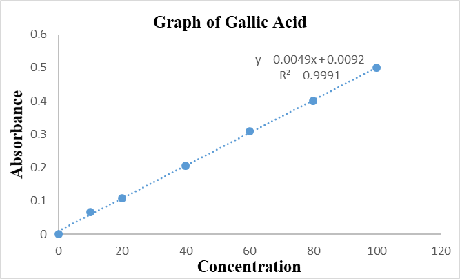 Procedure: The total phenolic content of the extracts of Celosia argentea was determined by Folin- Ciocalteau assay method. To an aliquot 100μl of extracts of Celosia argentea (1mg/ml) or standard solution of Gallic acid (10, 20, 40, 60, 80, 100 μg/ml) added 50μl of Folin-ciocalteau reagent followed by 860μl of distilled water and the mixture was incubated for 5min at room temperature. 100μl of 20% sodium carbonate and 890μl of distilled water were added to make the final solution to 2ml. It was incubated for 30 min in dark to complete the reaction after that absorbance of the mixture was measured at 725 nm against blank. Distilled water was used as reagent blank. The tests were performed in triplicate to get the mean values. The total phenolic content was found out from the calibration curve of Gallic acid, and it was expressed as milligrams of Gallic Acid Equivalents (GAE) per gram of extract