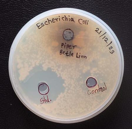 An extract’s ability to stop germs from growing is known as its antimicrobial activity. Plants, animals, and humans are all infected by these microbes. Piper betle Linn demonstrated effective antibacterial properties. We conducted an antimicrobial assay to assess the antibacterial efficacy of Piper betle Linn (Table 3 and figure 5). E. Coli was utilized to test the antibacterial effects. In This Plant the Antifungal assay was Compare to Standard and Test Sample. The Test Sample was Low Inhibit to Bacteria.