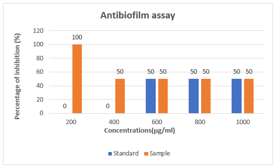 The Antibiofilm assay of Piper betle Linn was tested using an Antibiofilm assay (Figure 3). In This Plant the Antibiofilm assay at Concentration 200 µg/ml was 100 % i.e. Higher Percentage of Inhibition as Compare to Other Concentration.