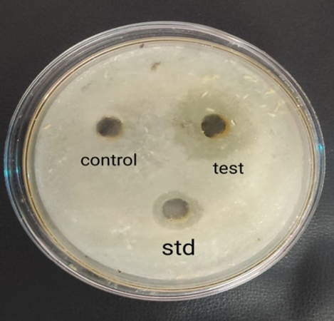 The widespread use of broad-spectrum antibiotics and immunosuppressive treatments has led to a significant clinical problem: fungal infections. Candida stands out as the most prevalent among all fungal species (Rattiporn et al., 2018). To prepare Sabouraud dextrose agar media, combine the necessary components and sterilize in an autoclave at 121°C for 15 minutes. Subsequently, pour the media into petri plates according to the required well sizes. Spread 100 µl of bacterial suspension evenly across the growth medium. Create 6 mm diameter wells using a cork borer. Add the standard to the designated well. Place the plates in an incubator at 37% for 24 hours. Following successful incubation, examine and measure the zone of inhibition.