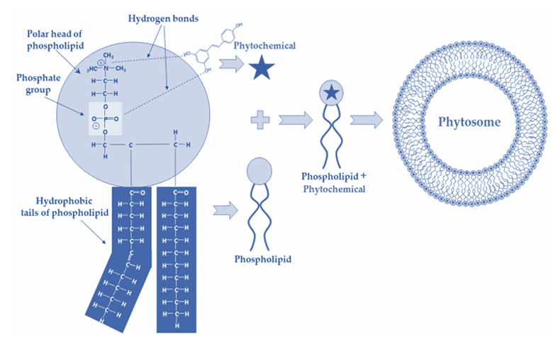 The extract structure of Phytosomes is a lipid compatible complex formed when bioactive plant constituents (usually water soluble) are chemically bound to phospholipid (choline head) binds to the plant compound, while the non-polar tails remain lipid soluble, creating a vesicle like arrangement that improves solubility, membrane passage and bioavailability.(5)