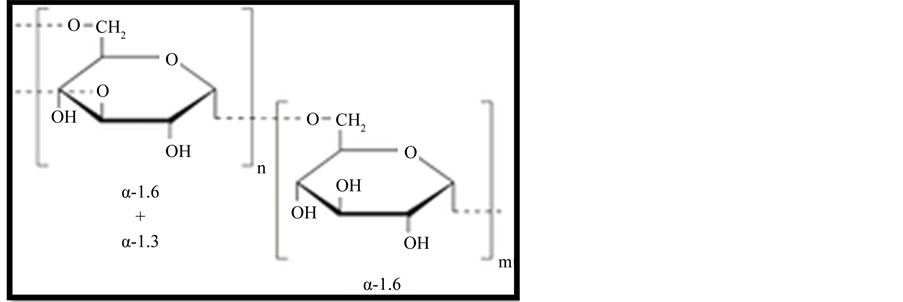 Dextranis defined by Leuconostoc mesenteroides which is actually a lactic-acid bacterium without which it is impossible to synthesize dextran using sucrose. It contains a glucan which is (16)-linked and has side chains that are attached to the backbone of 3-positions of glucose units. The straight chain consists of α-1,6 glycosidiclinkages between the molecules of glucose. The branching starts from α-1,3 linkages (Figure 1.8).