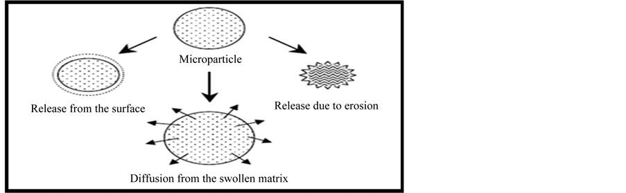 Diffusion controlled drug delivery systems are classified into two types: reservoir systems (or core-shell systems) and matrix systems (one-block or monolithic systems). In reservoir systems, there are three phases, water diffusion, drug dissolution and drug diffusion, that occur in a sequence with an initial phase (Figure 1.2). The drug diffusion phase is the rate-limiting step as in the case of drug reservoir systems. As this kind of system does not have polymer barriers or boundaries, it shows a high initial drug release rate, followed by a low release rate with the function of the time because of the increasing distance for the accessible drug to diffuse to the surface. It results in dependency of the release rate on the shape and geometry of the drug vehicle [8].