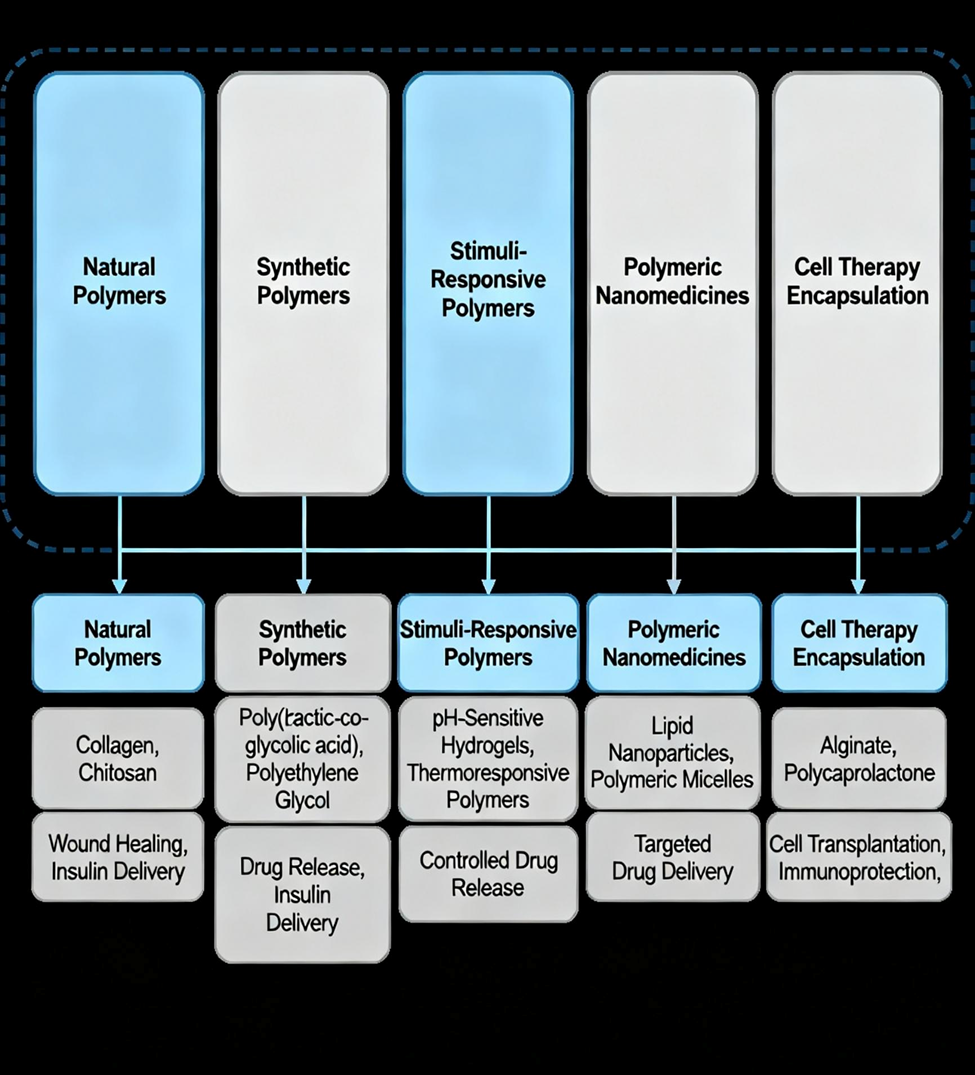 The period from 2022 to 2025 has witnessed unprecedented advancement in polymer-based interventions for diabetic complications. Both natural polymers (chitosan, alginate, hyaluronic acid, gelatin, collagen, silk fibroin, cellulose) and synthetic polymers (PLGA, PEG, PVA) have demonstrated remarkable versatility in addressing diverse aspects of diabetes management. Stimuli-responsive polymers, particularly glucose-responsive systems, represent a transformative approach enabling closed-loop insulin delivery. Polymeric nanomedicines including nanoparticles, micelles, and dendrimers have enhanced drug bioavailability and therapeutic efficacy. Electrospun nanofibers and hydrogel-based wound dressings have significantly improved diabetic wound healing outcomes. The clinical translation of these technologies, exemplified by FDA approvals and successful clinical trials, underscores the immense potential of polymer-based therapeutics in revolutionizing diabetes care and improving patient quality of life. Continued interdisciplinary collaboration between polymer scientists, biomedical engineers, and clinicians will be essential for realizing the full potential of these advanced materials in diabetes management.