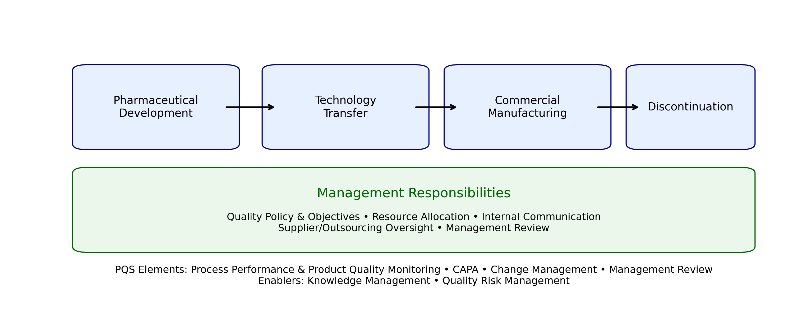 The ICH Q10 Pharmaceutical Quality System (PQS) provides a comprehensive, lifecycle?oriented model that integrates quality principles across four key stages: pharmaceutical development, technology transfer, commercial manufacturing, and product discontinuation. This unified framework ensures that quality is proactively built into products and processes from initial design through ongoing production and eventual withdrawal from the market.