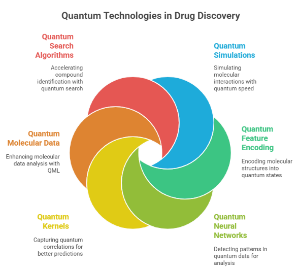 Quantum?????? simulations and quantum-enhanced computational techniques signify a fundamental change in drug discovery, as they offer ways to overcome the main limitations of traditional methods. In fact, these methods by accurately simulating molecular interactions and taking into account quantum effects improve the prediction of drug-target binding, optimize candidate molecules, and lower the number of experimental trials needed. Quantum computing makes molecular docking more accurate by taking into account protein flexibility, solvation effects, and complex energetic interactions, while quantum machine learning can be used to perform virtual screening in a much more efficient and accurate way over a large chemical space. In addition, quantum molecular dynamics, wavefunction simulations, quantum phase estimation, quantum walks, quantum Monte Carlo methods, and excited-state calculations are just some of the few examples of the unprecedented insights into molecular behavior, reaction pathways, and thermodynamic and electronic properties that can be gleaned. Together, these breakthroughs provide the means not only to speed up the identification and optimization of therapeutics but also to reduce the development costs and widen the drug discovery scope. The ongoing development of quantum technologies and their eventual adoption in pharmaceutical research is anticipated to revolutionize the efficiency, accuracy, and creativity potential of drug development by, among other things, enabling personalized medicine and the design of next-generation ??????therapeutics.