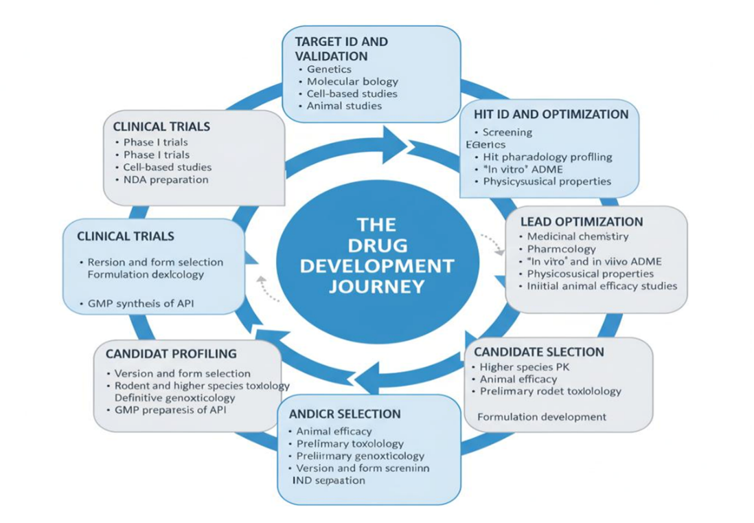 Drug discovery and development is a complex, multi-stage process that integrates chemistry, biology, pharmacology, and computational sciences to transform an initial idea into a therapeutic agent. The stages include target identification, hit discovery, lead optimization, preclinical evaluation, regulatory submission, and clinical trials. Each step is crucial, as attrition rates in drug discovery are high, and only a fraction of compounds ever reach the market [1].
