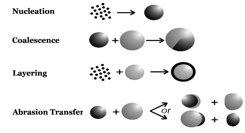 Coalescence is the formation of large sized particles by random collision of well-formed nuclei, the mechanism requires slight excess moisture on the nuclear surface17. Without a minor excess of moisture, coalescence needs additional mechanical stress. The number of nuclei is reduced during this phase while mass of the remains constant during this phase19.