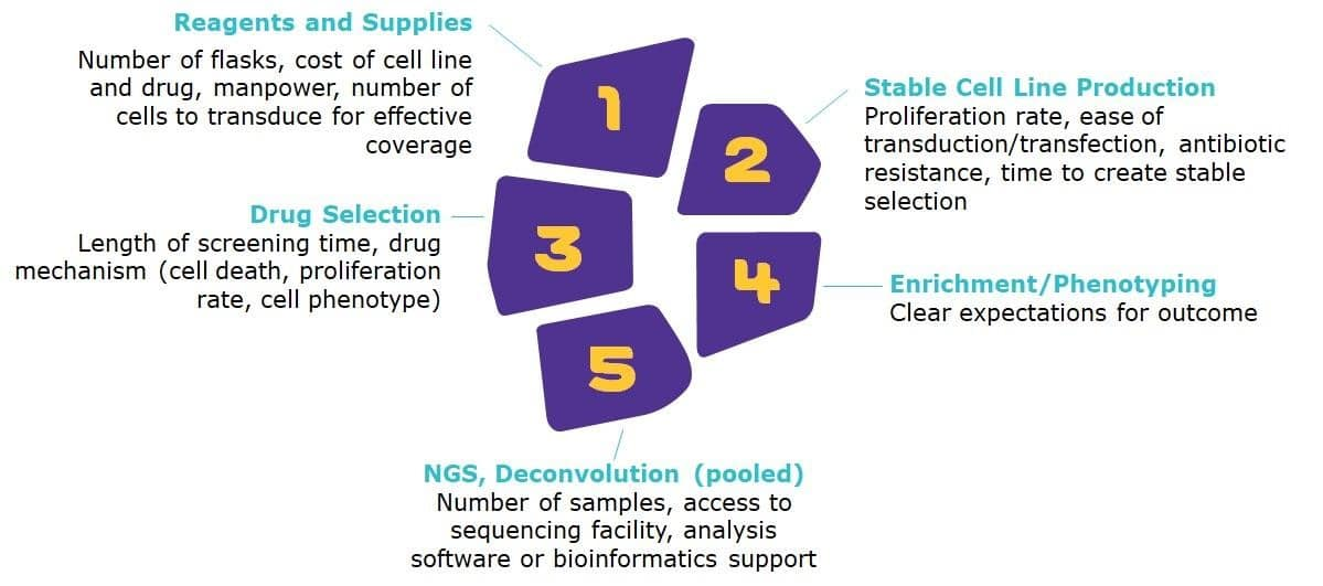 When designing a CRISPR screen, the initial consideration pertains to the availability of requisite materials. Variables including the cost and scalability of reagents and cellular models significantly influence screen design. For instance, the substantial number of cells necessitated by screening protocols may be impractical when utilizing primary cells, thereby necessitating the adoption of a cell line boasting heightened proliferative capabilities. Moreover, the cost and availability of reagents assume paramount importance due to their potential to impinge upon screen scope.