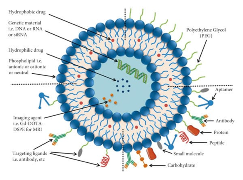 The schematic highlights several strategies employed to enhance liposomal functionality. Conventional liposomes generally lack surface modifications and therefore exhibit relatively short circulation times in systemic circulation. In contrast, PEGylated liposomes incorporate polyethylene glycol chains on their surface, which significantly improves stability and prolongs circulation by reducing recognition by the reticuloendothelial system. Additionally, targeting ligands can be conjugated to the liposomal surface to enable selective interaction with specific cellular receptors. In certain advanced formulations, multiple ligands may be incorporated simultaneously to further improve targeting precision and delivery efficiency?.