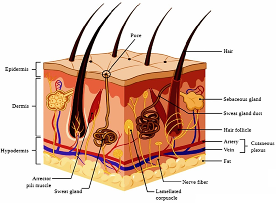 The skin is the largest organ of the human body, acting as a primary protective barrier against dehydration, physical injury, and microbial invasion. In adults, its surface area ranges from approximately 1.5 to 2.0 m². Structurally, the skin is composed of three main layers: the epidermis, dermis, and hypodermis¹². The epidermis is the outermost layer, with a thickness between 60 and 800 μm. Its uppermost sublayer, the stratum corneum (10 - 20 μm thick), serves as a critical barrier to prevent water loss and limit the entry of external substances into the body. The dermis lies beneath the epidermis and contains connective tissues, sweat glands, nerve endings, hair follicles, lymphatic vessels, and capillaries. The hypodermis, the innermost layer, is composed mainly of adipose tissue, providing cushioning and structural support to the upper layers. Beyond its barrier role, the skin also functions as a shield against ultraviolet (UV) radiation due to its melanin content¹³. It contributes to thermoregulation through mechanisms such as sweating and participates in excreting substances including xenobiotics, excess lipids, salts, urea, uric acid, ammonia, and other metabolites. Transdermal drug delivery systems (TDDS) utilize the skin as a site for drug administration. In this route, the active compound penetrates the skin and enters systemic circulation via dermal blood vessels, subsequently distributing throughout the body. TDDS offers several patient-centered advantages, such as avoidance of first-pass metabolism, reduced dosing frequency, potential for non-invasive or minimally invasive application, ease of self-administration, and elimination of the need for trained medical staff.