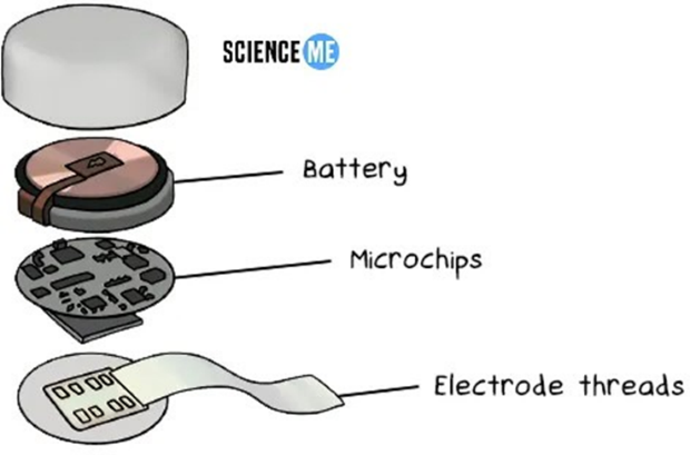 Hermetically sealed, coin- sized device surgically embedded in the skull. |