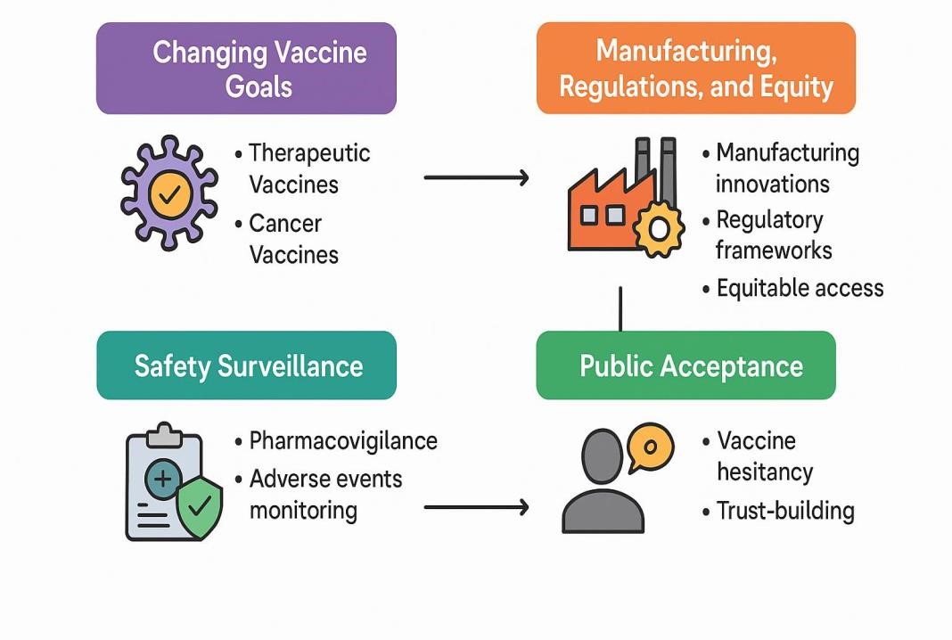 Importantly, the scope of vaccines is expanding from purely preventive measures against infectious diseases to therapeutic applications. Personalized cancer vaccines, autoimmune-modulating vaccines, and vaccines for chronic infectious diseases such as HIV, hepatitis, and tuberculosis are being actively investigated. The concept of universal vaccines, particularly for rapidly mutating viruses like influenza and coronaviruses, is a major research focus. By targeting conserved epitopes or employing mosaic immunogens, researchers aim to achieve broad and long-lasting immunity, reducing the need for frequent updates.Despite remarkable progress, challenges remain. Global disparities in vaccine access, public hesitancy fueled by misinformation, manufacturing bottlenecks, and evolving regulatory landscapes continue to shape the vaccine ecosystem. Equally important is the need for robust post-marketing surveillance to ensure long-term safety and to build public trust.Thus, vaccine development today stands at the intersection of innovation and necessity. The integration of modern biotechnology, computational power, and global collaborative frameworks has not only transformed the speed and scope of vaccine discovery but has also opened pathways for tackling complex diseases previously considered beyond the reach of immunization. This review provides a comprehensive overview of these emerging trends, highlighting key advances, challenges, and the future directions that will define the next generation of vaccines.[17]