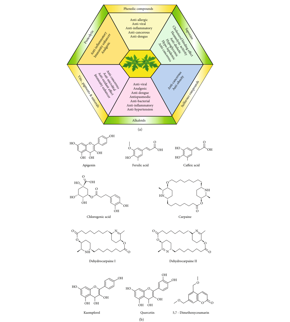 Figure 2: Chemical constituents and structure of some important compounds of C. papaya leaves. (a) Constituents of C. papaya leaves along with functional uses; (b) chemical structures of important bioactive compounds present in C. papaya leaves. [23]