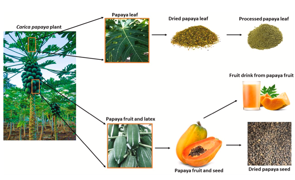 Fig. 1. Papaya plant and its processing. Different parts of the plant including the leaves, fruits, latex, and seed can be processed for different use. This may be for medicinal, nutraceutical or industrial purposes. [10]