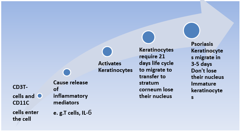 When autoimmunity is present, the body attacks itself. Psoriasis is one kind of autoimmune disease. WBCs induce scrap infection by invading and eliminating invasive bacteria. In psoriasis, T lymphocytes target the skin cells. It is possible that this onslaught will speed up the production of skin cells. The increased production of skin cells leads to an overabundance of new skin cells. The hyperproliferated skin cells migrate toward the skin's outer layer wherever they gather.