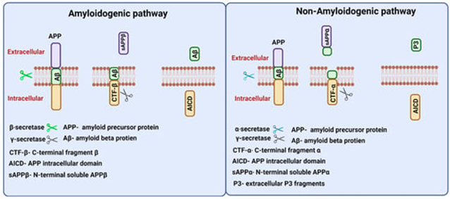 Figure 5. Amyloid forerunner protein (APP) converts. Two proteolytic pathways, amyloidogenic and non-amyloidogenic handle, live for APP convert. The amyloidogenic road includes β and γ secretases and releases N-terminal dissolved APPβ fragments, and Aβ peptides in the extracellular domain. The non-amyloidogenic includes α and γ secretases and releases N-terminal APPα fragments, and P3 peptides in the extracellular domain. Both proteolytic pathways release APP intracellular rule (AICD) fragments intracellularly (29)