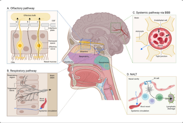 In this review, the carnal pathways and makeups had connection with medicine transfer from the nasal crater to the mind are presented by separating bureaucracy into natural and lymphoid types. Figure shows a diagrammatic delineation of the physiologic schemes complicated in nasal- mind medicine transfer. The direct routes of medicine parturition from the nasal crater (inky spotted arrows in Fig. A, B, and D) to the intelligence and cloverleaf routes (sky spotted arrows in Fig. B – D) through the abecedarian distribution were described. Brain targeting through the intranasal route generally occurs through three pathways the respiratory pathway( a circular route), the olfactory pathway, and the trigeminal pathway( a direct route) (16).Intranasally administered medicines can travel through different pathways, including immersion by the nasal mucosa into the systemic rotation, axonal transport to the olfactory bulb, or direct entry through the trigeminal whim-whams (17). Both the olfactory and trigeminal pathways are considered effective and safe routes for delivering active substances to the brain (18).Gaining a comprehensive understanding of the mechanisms underpinning these pathways is essential for contriving effective remedial strategies for Alzheimer’s complaint. The olfactory neuronal pathway encompasses intra- and extra-neuronal mechanism (19), gauging the olfactory epithelium, olfactory bulb, and lamella propria. Administered medicines reach the olfactory bulb from the olfactory region through a transcellular medium. also, colourful mechanisms similar as paracellular transport, transcytosis, and prolixity, as well as the involvement of efflux transporters (20), can come into play grounded on the physicochemical parcels of the medicine. The olfactory bulb serves as a direct conduit for distributing the medicine to different brain regions, including the piriform cortex, hypothalamus, and Amygdala(21).