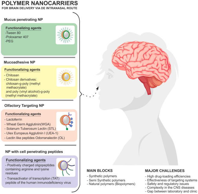 In nanoparticle-located arrangements have been explained to raise the permeability and assimilation of drugs, their uptake in the affecting animate nerve organs domain, and their approach and accumulation into the CNS. At the same time, they can defend healing powers from degradation and forbid their extracellular transport by extroverted transporters. Moreover, the blend of nanotechnology with additional game plans has granted to favour the accumulation of IN nanoparticulate-located wholes into the CNS. Several surfactants are used to simplify drug permeation, to a degree pegylated fragments, while mucoadhesive polymers intelligent to interact accompanying mucin, to a degree chitosan, are used to extend its palace opportunity. On the other hand, combining cell-stinging peptides (CPP) that can communicate accompanying biological membranes advances natural rude answer. The use of nanoparticulate-based arrangements together with added plannings in the way that incorporating transportation enhancers and/or mucoadhesive powers, with others, has authorized to gain a taller degree of discriminating drug transfer to the mind. Different nanoparticulate-based structures have proved hopeful in vivo results related to pharmacokinetic limits in the mind later an IN administration. Important mind pharmacokinetic limits were reinforced, increasing Cmax (maximum drug aggregation in the goal fabric), area under the curve (AUC, matching to the complete of the body tissue concentration —or fabric aggregation— of a drug against an outlined time pause), and mean memory opportunity, while reducing Tmax (period wanted to gain the Cmax in the target side (23). Although progress has been positive, there are still persistent limitations and challenges that must be addressed to achieve consistent and predictable nose-to-brain drug delivery. First of all, the intranasal administration dosage is really limited, with young men and women having a nose volume of about 6 cm3, and can only be administered under 200 μl. Moreover, the rapid clearance of drugs from the nasal cavity and the potential for enzymatic degradation present hurdles that require further investigation. Also, the nasal mucus, nasal epithelium, and lamina propria collectively form the inherent anatomical barrier to the nose-to-brain drug delivery. Last but not least, the possible toxicity on nasal cilia or different nasal cells, the generation of local inflammation, and the potential systemic effect are the primary safety concerns (24).