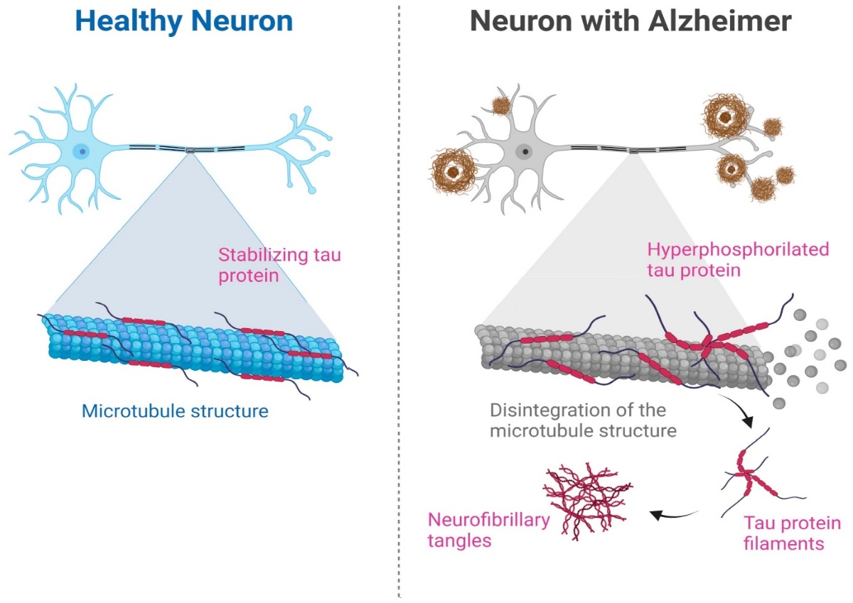 There are a lot of neurons in the intelligence, each holding an axon and various dendrites. Neurons demand ideas, absorption, and self-repair in consideration of be healthful. All three of these important tasks are upset by AD. Neuritic plaques/ β-amyloid plaques and neurofibrillary tangles (NFTs) are two of AD's different lesions. Firstly, in the case of Neuritic plaques, deposits of the β-amyloid protein fragment amplify in the breach middle from two points nerve containers (neurons). The component of amyloid memorial is the amyloid forerunner protein (APP) that sticks through the neuron sheet, and enzymes like β-secretase and α-secretase cut the APP into fragments of protein (neurotoxic Aβ42 fragments), containing β-amyloid. Thus β-amyloid fragments meet in clumps to form plaques. Numerous of these aggregates evolve in AD, obstruct the function of neurons. This for the most part impacts the hippocampus and different parts of the using one's brain layer. Secondly, in the case of NFTs, microtubules compensate any of the within support makeup of neurons. Microtubules are helped in their cohesion by a protein famous as tau. When “tau” is changed in AD, the microtubules decay, and the tau protein collects to form neurofibrillary tangles (Tsering and Prokop, 2023). However, further all along AD, neurons from few regions of the mind, exceptionally the rind and limbic domain, containing the hippocampus and amygdala, evenly shame and eventually bring about the obliteration of the neurons, on account of that the intelligence is stated expected tinier in breadth, folds and grooves of external coatings are dwindle, and ventricles are best distinguished to an active mind (13).