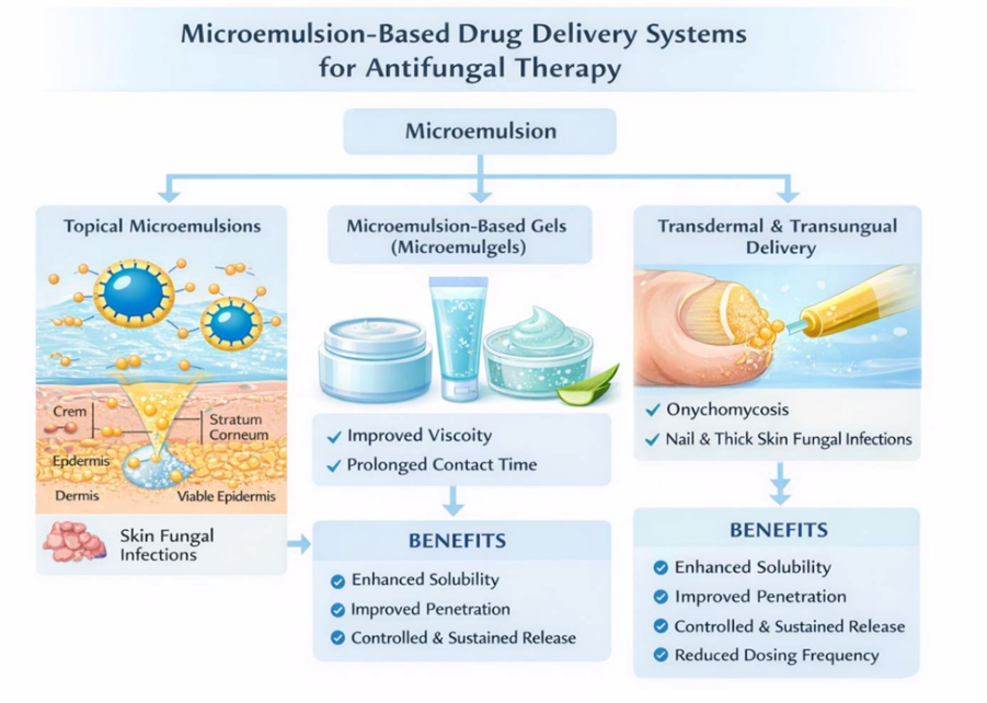 Fungal infections continue to pose a major therapeutic challenge worldwide, affecting skin, nails, mucosal tissues, and systemic organs, particularly in immunocompromised patients. Although several classes of antifungal agents such as azoles, polyenes, echinocandins, and allylamines are clinically available, their effectiveness is often limited by poor aqueous solubility, low bioavailability, inadequate tissue penetration, frequent dosing, and dose-related toxicity. These limitations have driven extensive research into novel drug delivery systems capable of improving antifungal therapy. Among these, microemulsion-based drug delivery systems have emerged as a promising and versatile approach. Microemulsions are thermodynamically stable, isotropic, and transparent dispersions of oil and water stabilized by suitable surfactants and co-surfactants, with droplet sizes typically in the nanometer range. Their unique physicochemical properties, including high solubilization capacity, large interfacial area, low surface tension, and ease of preparation, make them highly suitable for delivering poorly water-soluble antifungal drugs. Microemulsions can enhance drug dissolution, improve permeation across biological barriers such as skin, nail plate, and gastrointestinal mucosa, and provide controlled or sustained drug release, thereby improving therapeutic efficacy and patient compliance.