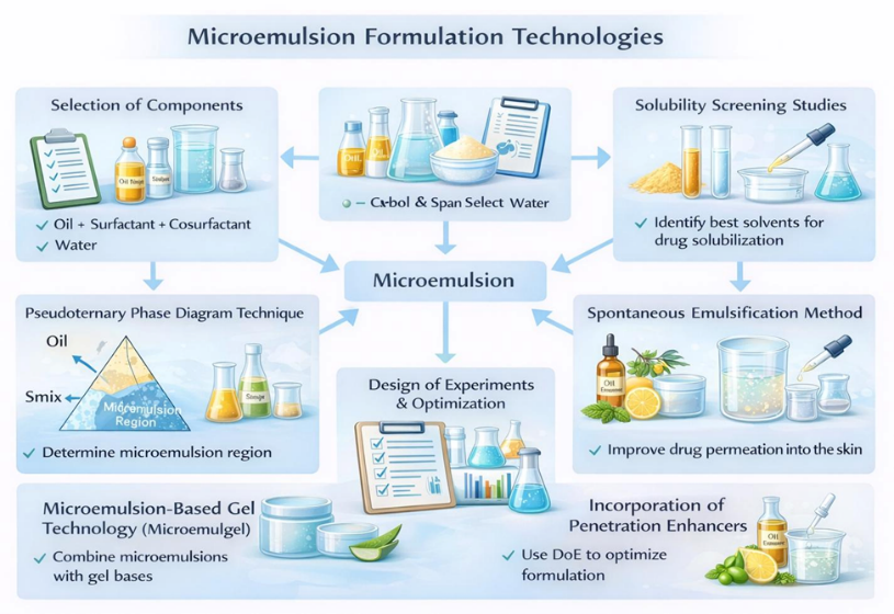 To improve viscosity, spreadability, and residence time on the skin, microemulsions can be incorporated into gel matrices using polymers such as Carbopol 934, Carbopol 940, or HPMC. This technology combines the penetration-enhancing properties of microemulsions with the favorable application characteristics of gels, resulting in improved patient compliance.