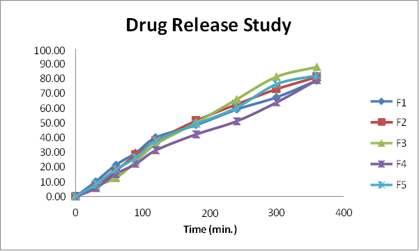 The in-vitro diffusion study was performed using Franz diffusion method. The study was conducted for over 360 minutes i.e. 6 hours. Table .7 shows the results of % Drug release of different Clove Oil cream formulations. From the given results, it was found that batch F3 should maximum release of 87.92% w/w as compared to other formulation. This is due to higher spreading capacity of the formulation because of which the Clove Oil showed easy and faster diffusion which can be correlated to faster achievement of therapeutic effect. Hence, Batch F3 was selected as the optimized batch. The Figure 8.10 shows the drug release of different Clove Oil cream.