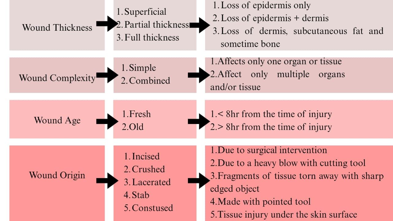 A wound is an injury that happens to a living tissue breaking the skin and mucous membrane and in turn causing pain and infection. It can be due to chemical, mechanical, or thermal trauma such as cut, blow, burn, pressure or any other impact on to the skin. It may also develop due to diseases like diabetes mellitus immunologic diseases or arterial insufficiency. A wound may vary in the appearance depending on location of injury, depth of injury, injury mechanism, acute vs chronic and wound sterility. Treatment strategies for wound healing will depend on classification of wound, whether acute or chronic.1,2