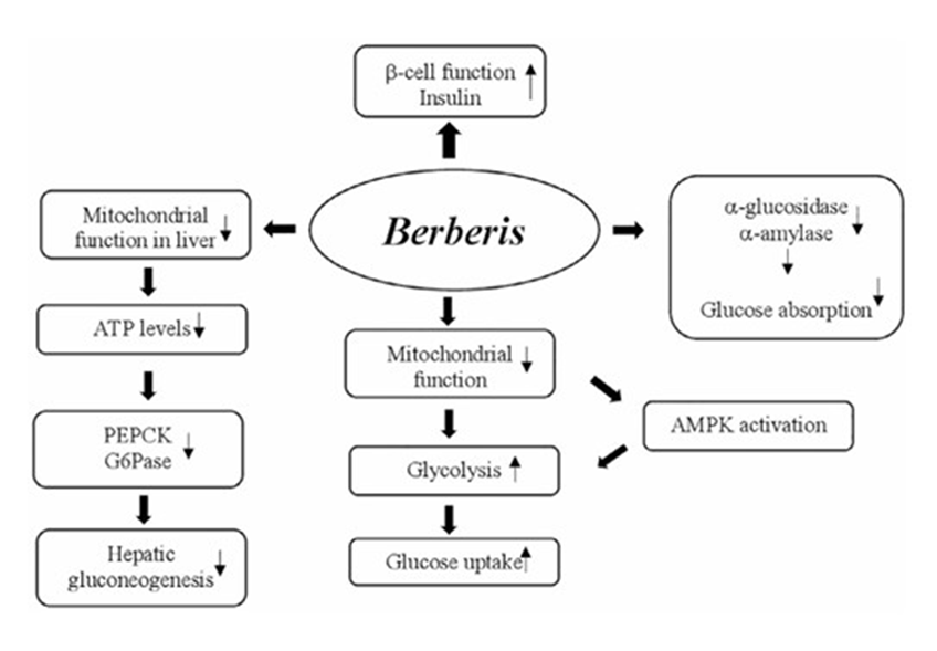 Various Mechanisms May Play A Role In The Regulation Of Glucose Metabolism By Berberine. These Mechanisms Include (A) Enhancing Insulin Sensitivity And Improving The Function Of Pancreatic Β-Cells By Repairing The Depleted Islets; (B) Reducing Intestinal Glucose Absorption Through The Inhibition Of Α-Amylase And Α-Glucosidase Activity; (C) Promoting Glucose Uptake Via The Induction Of Glycolysis, Which Is Triggered By The Inhibition Of Mitochondrial Function. This Latter Effect Also Results In The Activation Of The Adenosine Monophosphate-Activated Protein Kinase (Ampk) Pathway; And (D) The Suppression Of Hepatic Gluconeogenesis Due To A Reduction In The Expression Of Gluconeogenic Genes (Phosphoenolpyruvate Carboxykinase [Pepck] And Glucose-6-Phosphatase [G6pase]). This Decrease Is Attributed To Atp Depletion Caused By The Suppression Of Mitochondrial Function In The Liver.[30]