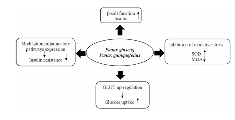 The Possible Mechanisms That Govern The Regulation Of Blood Glucose By Ginseng May Be Associated With (A) The Enhancement Of Pancreatic Β-Cell Function And Insulin Sensitivity; (B) The Promotion Of Glucose Uptake Through The Up-Regulation Of Glut Expression; (C) The Reduction Of Oxidative Stress By Increasing Superoxide Dismutase (Sod) Activity And Decreasing Malondialdehyde (Mda) Levels; And (D) The Modulation Of The Expression Of Inflammatory Pathways (E.G., Tnf-Α Or Endothelial Nitric Oxide Synthase [Enos]) To Avert The Development Of Insulin Resistance.[35]