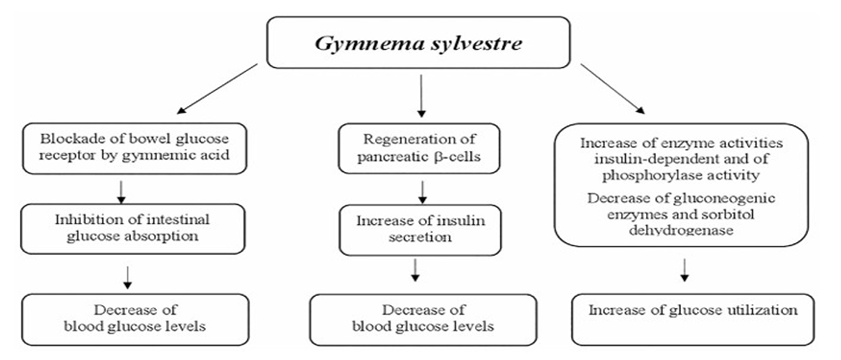 Due To Its Resemblance To Glucose, Gymnemic Acid Attaches To The Receptors Found On The Taste Buds, Which Prevents Activation By The Sugar Contained In Food, Leading To The Non-Absorption Of That Sugar. Additionally, Gymnemic Acid Interacts With The Na+-Glucose Symporters Situated In The Outer Layer Of The Intestine, Thereby Inhibiting The Absorption Of Glucose.[37] Furthermore, The Hypoglycemic Effects Of Gymnemic Acid Are Achieved By Enhancing Insulin Secretion And Facilitating The Regeneration Of Pancreatic Β-Cells.[38] The Hypoglycemic Effects Of Gymnemic Acid Also Encompass An Increase In Glucose Utilization, Attributed To Heightened Activities Of Insulin-Dependent Enzymes Such As Hexokinase, Glycogen Synthetase, Glyceraldehyde 3-Phosphate Dehydrogenase, And Glucose 6-Phosphate Dehydrogenase. Additionally, There Is An Enhancement In Phosphorylase Activity, Accompanied By A Reduction In Gluconeogenic Enzymes And Sorbitol Dehydrogenase.[39]