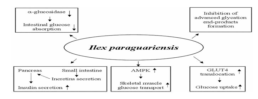 Research Involving Animals Has Demonstrated The Proposed Hypoglycemic Mechanisms Of Bioactive Substances, Particularly Polyphenols, Found In Paraguariensis. These Compounds Have A Glucose-Lowering Effect. (A) Enhancing Insulin Secretion By Both Stimulating Its Release From The Pancreas And Promoting The Secretion Of Incretins In The Small Intestine, Which Subsequently Encourages Insulin Release From The Pancreas; (B) Promoting Glucose Transport In skeletal Muscle Through Ampk Activation; (C) Facilitating Glut4 Translocation And Enhancing Glucose Uptake Activity; (D) Blocking Α-Glucosidase Thereby Decreasing Intestinal Glucose Absorption; And (E) Preventing The Formation Of Advanced Glycation End Products.[47]
