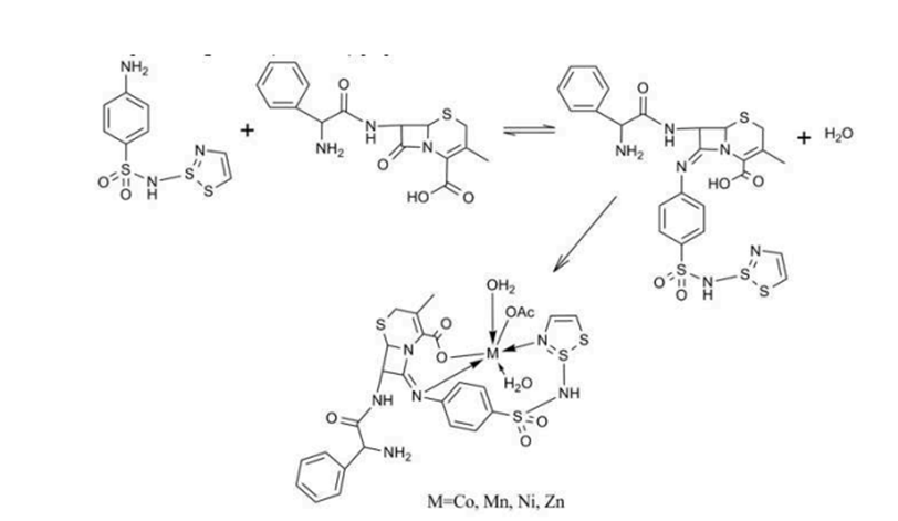 By refluxing 1 mmol of cephalexin and 1 mmol of sulphathiazole in hot methanol, Anacona et al. created a sulphathiazole-based SCHIFF'S base. The reaction mixture was then refluxed in a nitrogen environment at 70 °C for three hours. Metal acetate salts of manganese, cobalt, nickel, and zinc dissolved in water were gradually added to the ethanolic solution of SCHIFF'S base ligand while being constantly stirred. A potassium hydroxide solution was then added to bring the pH down to 7-8, and the reaction mixture was refluxed for four hours. When the SCHIFF'S base ligand and its metal chelates were tested against Staphylococcus aureus and E. coli, the results showed that the ligand had a zone of inhibition of 12.0 ± 1.0 and 15.0 ± 1.0 mm, while the metal complexes showed a zone of inhibition of 6.0 ± 1.0 and 18.0 ± 1.0 mm against the two bacteria.[6]
