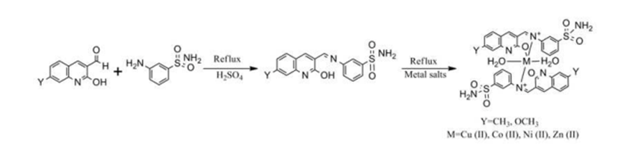 By refluxing 3-aminobenzenesulphonamide with 2-hydroxy-7-methylquinoline-3-carbaldehyde and 2-hydroxy-7-methoxyquinoline-3-carbaldehyde in ethanol using con. H2SO4 as a catalyst for 5 hours at 75 °C, Athar et al. created the SCHIFF'S base ligands, 3-{[(1E)-(2-hydroxy-7-methylquinolin-3-yl)methylene]amino}benzenesulphonamide and 3-{[(1E)-(2-hydroxy-7-methoxyquinolin-3-yl)methylene]amino}benzenesulphonamide. For five to seven hours at 70 to 75 degrees Celsius, the resulting SCHIFF'S bases were refluxed with Cu, Co, Ni, and Zn salts in a 2:1 ratio. Gram-positive bacteria like Bacillus cereus and Streptococcus pneumoniae, as well as gram-negative bacteria like Escherichia coli and Klebsiella pneumoniae, were tested for the antibacterial activity of the synthesized ligand and complexes using the disc diffusion technique. The findings demonstrated that the metal chelates outperformed the SCHIFF'S base ligands in terms of antibacterial activity.[5]