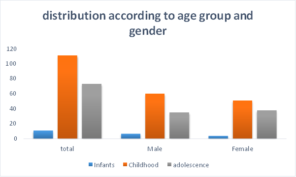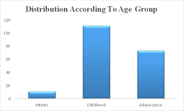 Table 2: This table consist of total no. of patients as per the age group. Total no. of infants (having age of new born to 1 year) are 11, no. of childhood (having age between 2 years to 12 years) are 111 and total no. of adolescence (having age 12 years to 18 years) are 73.(AS SHOWN IN FIGURE:2)