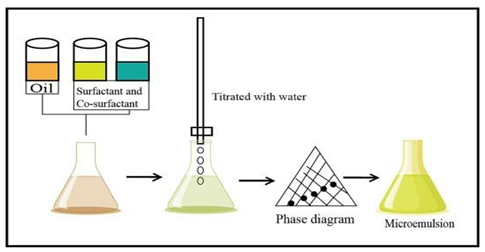Phase Titration Methods:- Microemulsions are formed through spontaneous emulsification (phase titration method) and can be studied using phase diagrams [28] . These diagrams help visualize the interactions between components, revealing various structures like emulsions, micelles, lamellar, hexagonal, and cubic phases [29] . The phase type—water-in-oil (w/o) or oil-in-water (o/w)—depends on the composition. Understanding phase equilibrium and boundaries is essential, and careful observation is needed to avoid metastable systems [30].