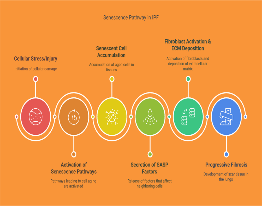 IPF stands out as a disease where abnormal tissue healing creates both excessive extracellular matrix buildup and permanent damage to the lungs [1]. The fibrotic process depends on cellular senescence which results in an irreversible growth arrest based on recent research findings [2]. Senescence-associated secretory phenotype (SASP) activates pro-inflammatory and pro-fibrotic processes when cells release their toxic secretory profile because of aging cells [3]. Existing IPF treatment methods provided limited results because they fail to address the senescence-based pathology at its source [4].