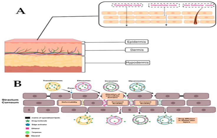 Fig. 1 Graphic representation of the structure of the skin and pathways of skin penetration of na noparticles (A) and the mechanisms involved in advanced vesicular skin penetration (B). Adapted with permission from [18] and Elsevier B.V Netherland.