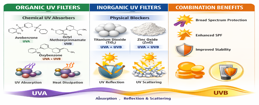Fig. 2 Comparison of organic and inorganic UV filters and their combined photoprotective benefits[43]