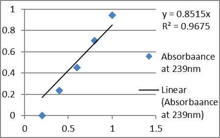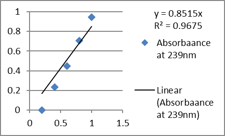 Standard stock solution containing 100μg/ml of Atovastatin calcium was prepared by dissolving 2.5mg of drug in minimum amount of methanol. Volume was made up to 25 ml with distilled water. Different aliquots were taken from the stock solution and diluted to 10ml with distilled water to prepare a series of dilutions (2µg/ml- 60µg/ml). The absorbances of the samples were recorded at λmax 239 nm.