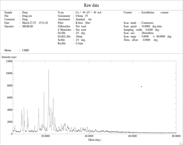 The diffraction pattern of pure Atovastatin calcium trihyadrate shown in figure. It is highly crystalline in nature as indicated by numerous peaks .From the X-ray diffraction peak we conclude that –