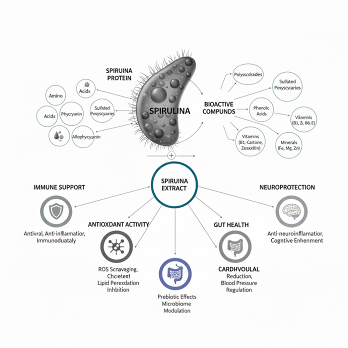 Spirulina, a blue-green microalga, has garnered significant attention as a potent functional food due to its exceptional nutritional profile and therapeutic potential [1]. It is rich in proteins, essential amino acids, vitamins, minerals, and bioactive compounds, standing out as a sustainable and nutrient-dense supplement [2]. Its high protein content, comprising 55–70% of dry weight, positions it as a superior plant-based protein source, surpassing traditional animal proteins in digestibility and amino acid composition [3].