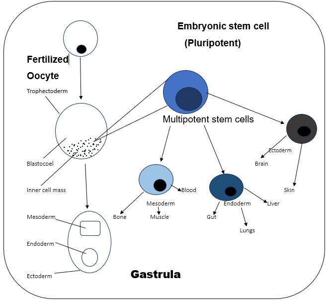 Fig.1 The blastocoel, which is created from oocytes, is made up of embryonic stem cells that can subsequently differentiate into mesodermal, ectodermal, or endodermal cells. Oocyte development and stem cell production. The gastrula is formed by blastocoel development.