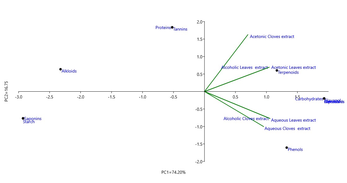 A principal component analysis (PCA) helps to reduce data dimentionality and easy visualize complex data. Further, it demonstrate how to characterise under the consideration related to one another and how that related to content separation during phytochemical analysis. Five of the main components (PCs) in this investigation had egenvalues greater than one, the variance seen among two plant parts and different three type solvent under 13 phytochemical parameter. The distribution of the two plant parts sampleunder study is depicted in the biplot (Fig.3) of the first two PCs, where PCs PC1 and PC2 have reported 74.20% and 16.75% variance of the original data, respectively. PC1 and PC2's combined percentage was 90.95%. Assessment of parameter loading was done to look into PC factors12. Preliminary Phytochemical investigation of Aqueous cloves extract of Allium sativum showed the presence of Glycosides, Flavonoids, Steroids, Phenols, Carbohydrates and Flavanol while in Alcoholic cloves extract of A. sativum showed the presence of Glycosides, Flavonoids, Steroids, Phenols, Terpenoids, Carbohydrates and Flavanol and Phytochemical analysis of Acetonic cloves extract of A. sativum showed the presence of Glycosides, Alkaloids, Flavonoids, Steroids, Terpenoids, Carbohydrates, Proteins, Tannins and Flavanol. Among these three solvents Acetonic extract showed the presence of more compounds as compared to Aqueous and Alcoholic extract. Preliminary phytochemical analysis of aqueous leaves extract of A. sativum indicates the presence of Glycosides, Flavonoids, Steroids, Phenols, Terpenoids, Carbohydrates, Flavanol while Alcoholic leaves extract of A. sativum showed the presence of Glycosides, Flavonoids, Steroids, Phenols, Terpenoids, carbohydrates, Proteins, Tannins and Flavanol and Phytochemical analysis of acetonic leaves extract of A. sativum showed the presence of Glycosides, Flavonoids, Steroids, Phenols, Terpenoids, carbohydrates, Proteins, Tannins and Flavanol. Among these three solvents alcoholic and acetonic extract showed the presence of more compounds as compared to aqueous extract in leaves. From the above result it has been observed that Preliminary phytochemical evaluation of Aqueous, Alcoholic and Acetonic cloves and leaves extract of A. sativum constitute Glycosides, Alkaloids, Flavonoids, Steroids, Terpenoids, Carbohydrates, Proteins, Tannins and Flavanol. A similar result were also observed by7. Hexane, Ethyl acetate, Methanol and Aqueous extract of Allium sativum contains Alkaloids, phenolics, Flavonoids, Steroids, glycosides and saponins, carbohydrates, terpenoids and tannins. Similar observations were also showed by13. Aqueous and Ethanol extract of A.sativum and C.longa consists of Saponins, alkaloids, tannin, Flavonoids, glycosides, lipids, ketones and phlobutanin. Various solvent extracts of A. sativum and A.cepa contains glycosides, alkaloids, Saponins, steroids, Flavonoids, phenols, tannins and Terpenoids8. Similar phytochemical observations were also noted by14. that Aqueous and Methanol extract of A. sativum possess anthraquinones, Saponins, triterpenes, Flavonoids, tannins, alkaloids and glycosides. Similar findings of phytochemical analysis of water, Ethanol and Acetone extracts of Allium sativum contains Reducing sugar, lipids, flavonoids, ketones, alkaloids, steroids and triterpenes15.
