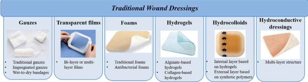 1.6.2 Wound dressing: The ideal wound dressing must possess the following characteristics: providing wound protection, ability to remove excess exudate, anti-microbial properties, maintaining a humid environment, high permeability to oxygen, easy removal from the wound site and non-anaphylactic characteristics[15]. The most commonly used materials are as follows.