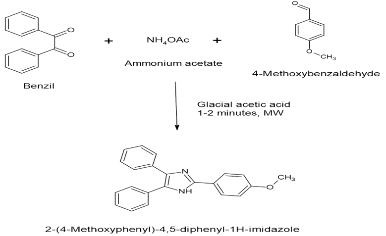 An equimolar mixture of Benzil (0.2mole), 4-methoxybenzaldehyde (0.02 mole), and Ammonium acetate (0.07mole) was placed in a Borosilicate beaker and thoroughly mixed using a glass rod. The reaction mixture was then subjected to Microwave irradiation for a total duration of 1–2 minutes. Upon completion of the irradiation process, the mixture was allowed to cool at room temperature before being quenched in ice water (70ml), followed by the addition of Ammonium hydroxide (6ml) to facilitate precipitation. The resulting solid product was collected by filtration using a Buchner funnel, washed with water, and subsequently dried. Finally, the crude product was recrystallized from ethanol to obtain a purified compound suitable for further characterization.