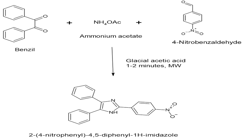 An equimolar mixture of Benzil (0.2mole), 4-nitrobenzaldehyde (0.02 mole), and Ammonium acetate (0.07mole) was placed in a Borosilicate beaker and thoroughly mixed using a glass rod. The reaction mixture was then subjected to Microwave irradiation for a total duration of 1–2 minutes. Upon completion of the irradiation process, the mixture was allowed to cool at room temperature before being quenched in ice water (70ml), followed by the addition of Ammonium hydroxide (6ml) to facilitate precipitation. The resulting solid product was collected by filtration using a Buchner funnel, washed with water, and subsequently dried. Finally, the crude product was recrystallized from ethanol to obtain a purified compound suitable for further characterization.