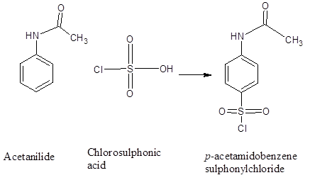 1.Put all of the p-acetamido benzene sulphonyl chloride in a 500 ml flask with a round bottom.
