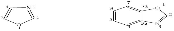 Benzoxazole is 1-oxa-3-aza-1H-indene, having molecular formula of C7H5NO, with melting point and boiling point of 29-30oC and 182oC.3 Benzoxazole is a planar molecule with conjugated π electrons sectate in the cyclic system. The lone pair of electrons on nitrogen, which is co-planar with heterocyclic ring and therefore not involved in delocalization, confers weakly basic properties.