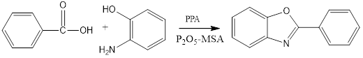 2-aminophenols can cyclize to benzoxazoles in the presence of carboxylic acids of upon heating to high temperature in the presence of a dehydrating agent (polyphosphoric acid, phosphorous pentoxide- methanesulphonic acid , H3BO3)5. When equimolar amounts of 2-aminophenols and alkyl or arylcarboxylic acids are heated to temperature of 140-220oC are required for the formation of the corresponding 2-alkyl or 2-arylbenzoxazoles.